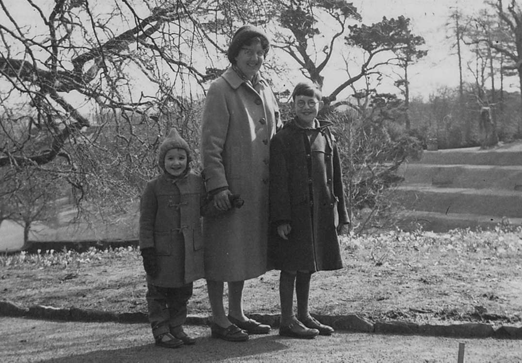 Irene with Colin and David at Dartington Hall Music College with the unique banked grass in the background